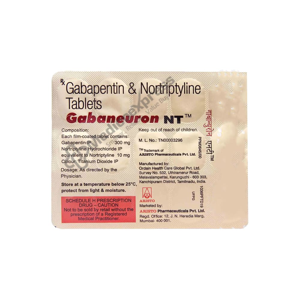 Gabaneuron NT Tablet 15's is a combination medication used to treat neuropathic pain. It is a chronic, progressive nerve disease that causes pain in the nerves. Symptoms include unprovoked pain, an unpleasant sensation, shooting, burning, or stabbing pain, difficulty resting or sleeping, and evoked pain (pain caused by events that are usually not painful).It has Gabapentin and Nortriptyline in it. Gabapentin alleviates nerve pain by binding to a specific site on voltage-gated calcium channels. Nortriptyline prolongs the effect of serotonin and noradrenaline while also preventing pain signal movement in the brain.Disclaimer:For More Information Contact Your Physician