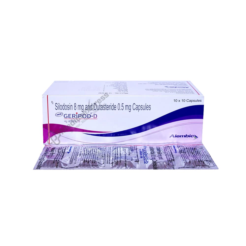 Geripod D Capsule 10 is a medication combination that is primarily used to treat the symptoms of benign prostatic hyperplasia (BPH) in adults who have an enlarged prostate gland. It aids in the relief of symptoms such as difficulty urinating or the desire to urinate more frequently, as well as the improvement of your ability to urinate. In the male reproductive system, the prostate is a small, muscular gland.Disclaimer:For More Information Contact Your Physician