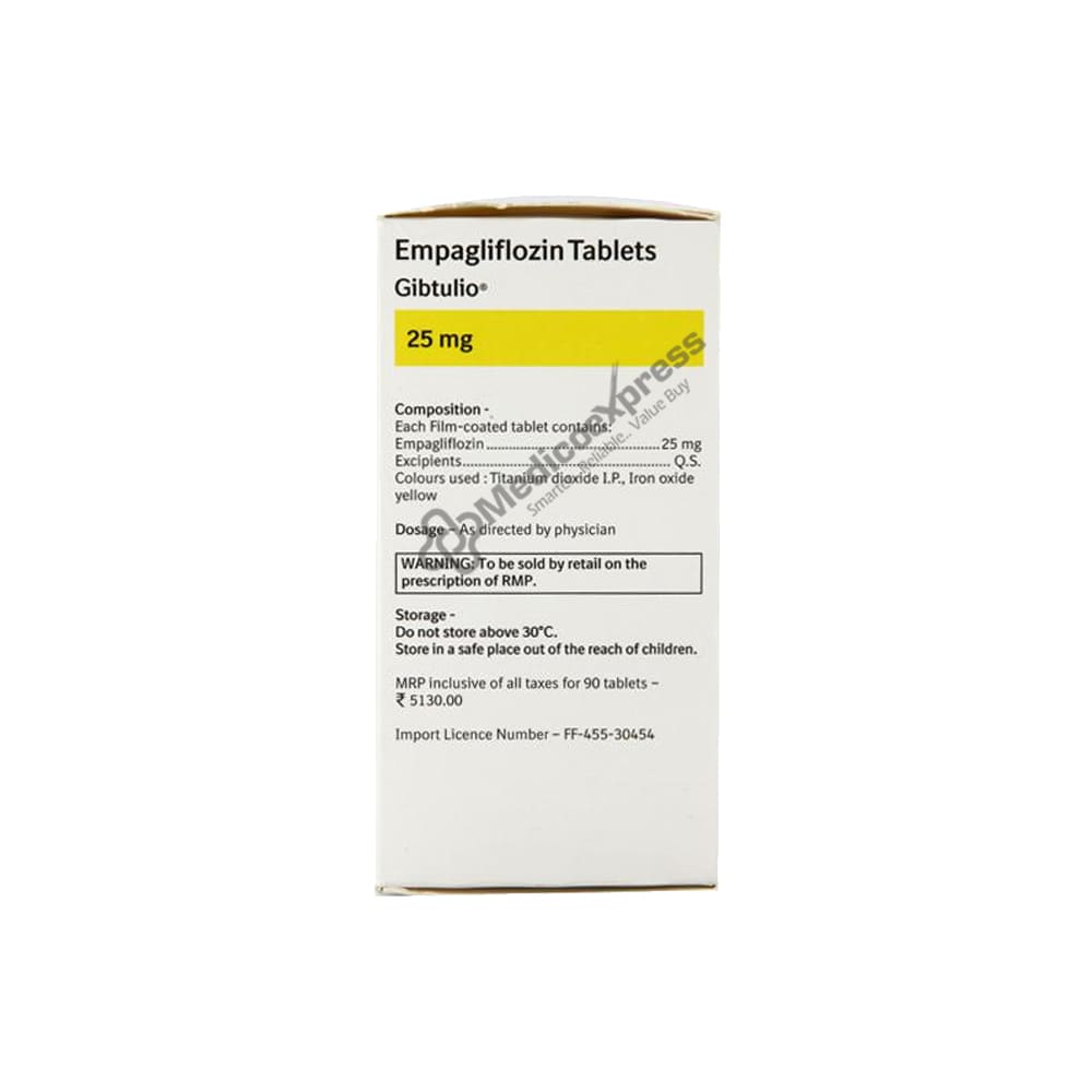 Gibtulio 25 mg Tablet 10'S contains Empagliflozin, a member of the class of medications known as anti-diabetic pharmaceuticals. Adults with type 2 diabetes who are unable to control their condition via diet and exercise alone are treated with it. In people with type 2 diabetes mellitus, it can also help avoid heart disease. Adult patients with heart failure who have poor pumping ability may also receive treatment for it. Diabetes is characterised by a body's inability to make and utilise enough insulin, a hormone produced by the pancreas, leading to abnormal blood glucose levels. It may manifest as increased hunger, thirst, or urination as well as symptoms such as cloudy vision, numbness in the hands or feet, or fatigue. When the heart is frail and unable to pump enough blood to the lungs, heart failure happens.Disclaimer:For more information contact your physician.