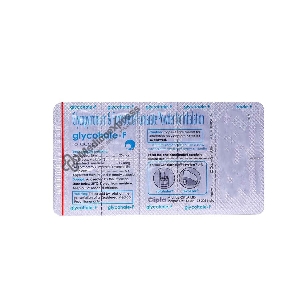 Glycohale-F Rotacaps 10 belongs to the class of medications known as bronchodilators, which are used to treat chronic obstructive pulmonary disease in the long term (COPD). COPD is a group of lung diseases that includes emphysema (breathing difficulty) and chronic bronchitis (inflammation of the bronchial tube lining).Disclaimer:For More Information Contact Your Physician