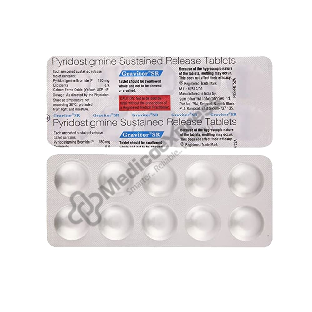 Gravitor SR Tablet 10 belongs to a class of drugs known as cholinesterase inhibitors, which are used to treat myasthenia gravis (muscle weakness).Disclaimer:For More Information Contact Your Physician
