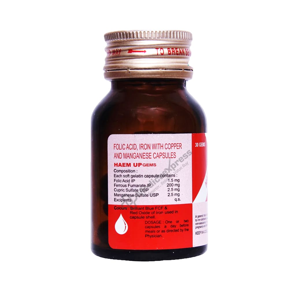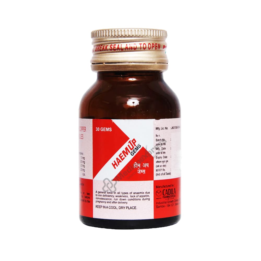 Haemup gems is an iron preparation enriched with folic acid and minerals that is intended to treat anaemia caused by iron deficiency, loss of appetite, weakness, low iron intake, convalescence (healing from illness or accident), pregnancy, and postpartum.Disclaimer:For more information contact your physician
