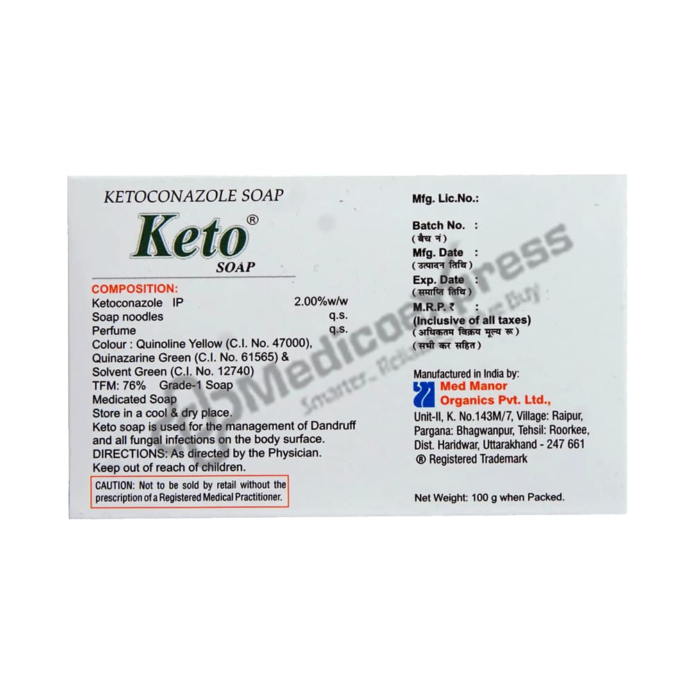 Keto Soap, 100 Gm Is An Antifungal Medication That Is Used To Treat Fungal Infections Of The Skin Such As Ringworm, Jock Itch, Athlete's Foot, Seborrheic Dermatitis (Dry, Flaky Skin On The Face, Scalp, Chest, Upper Back, Or Ears), And Pityriasis (a Skin Rash Characterised By Scaly, Discoloured Spots On The Chest, Back, Legs, And Arms).Disclaimer:For More Information Contact Your Physician
