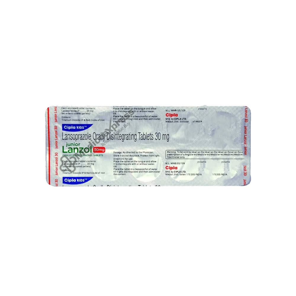 Lanzol Junior 30mg Tablet 10 belongs to a class of antiulcer medications known as 'proton pump inhibitors,' which are used to treat stomach and intestinal ulcers, inflammation of the food pipe (oesophagus), gastro-oesophageal reflux disease - GERD (reflux of gastric contents into the oesophagus), heartburn, regurgitation, ulcers caused by pain relievers, infections caused by Helicobacter pylorDisclaimer:For More Information Contact Your Physician