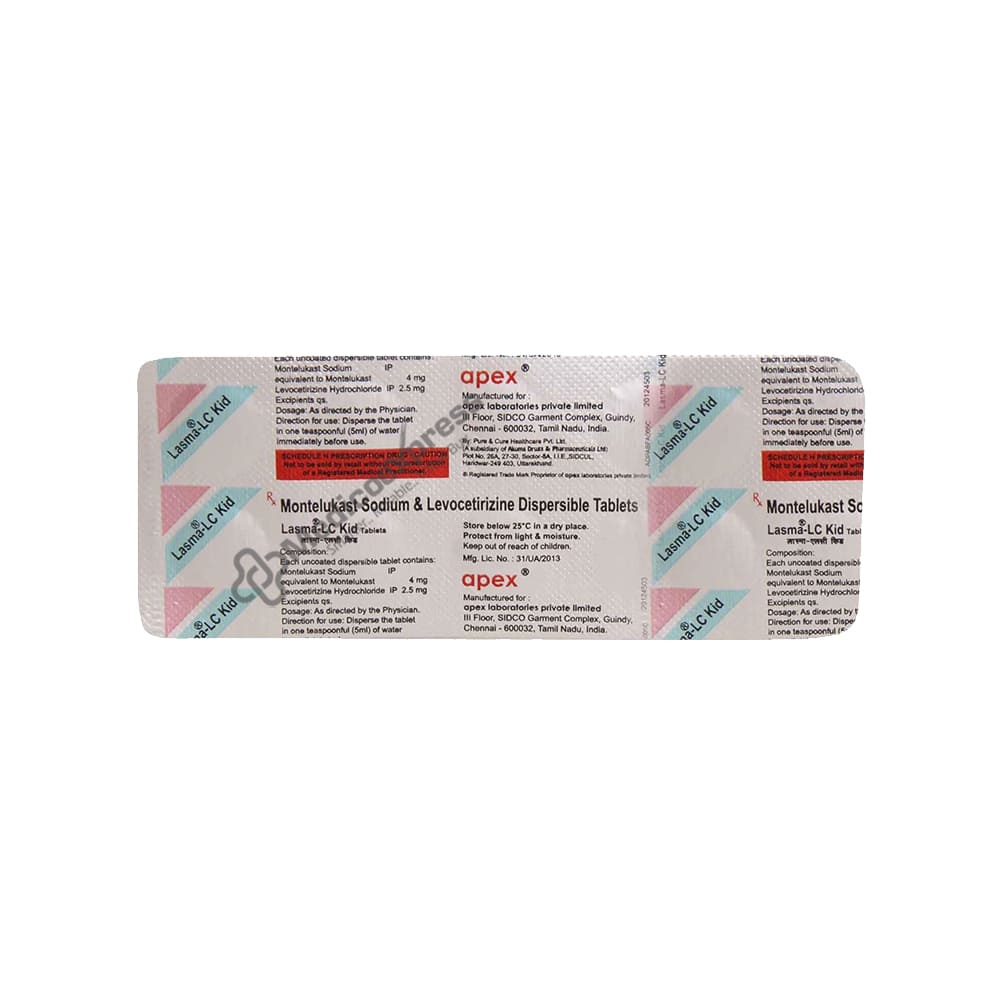 The Lasma LC Tablet 10's, a combination drug, is used to treat allergy symptoms such runny or stuffy noses, sneezing, itching, puffiness, watery eyes, and congestion. Additionally, it helps to ease breathing by reducing inflammation in the airways.Disclaimer:For more information contact your physician.