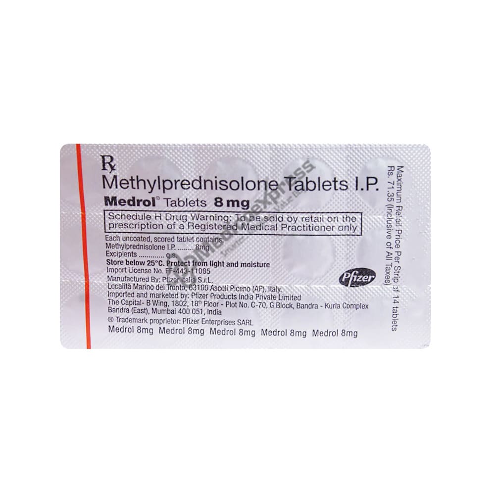 Medrol Tablet 14's contain the corticosteroid Prednisolone. Corticosteroids and anabolic steroids are not the same thing. It relieves symptoms by preventing the release of chemicals that cause inflammation (redness and swelling) and allergies.Disclaimer:For More Information Contact Your Physician