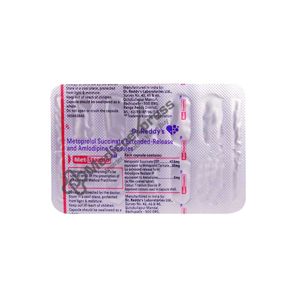 Met-Stamlo 50 Mg Capsule 10, is used to treat hypertension (increased blood pressure). A permanent or chronic condition known as hypertension (high blood pressure), heart disease is brought on when the blood's force against the arterial walls is too great. The heart and arteries may not work correctly if it persists for a long time. This can harm the blood arteries in the kidneys, heart, and brain, which can lead to renal failure, heart failure, or a stroke. Blood pressure reduction may lower the risk of heart attacks and strokes.A fixed-dose combination of two drugs, Amlodipine and Metoprolol, is known as Met-Stamlo Capsule 10's. Amlodipine is a calcium channel blocker, whereas Metoprolol is a member of a class of drugs.Disclaimer:For more information contact your physician.