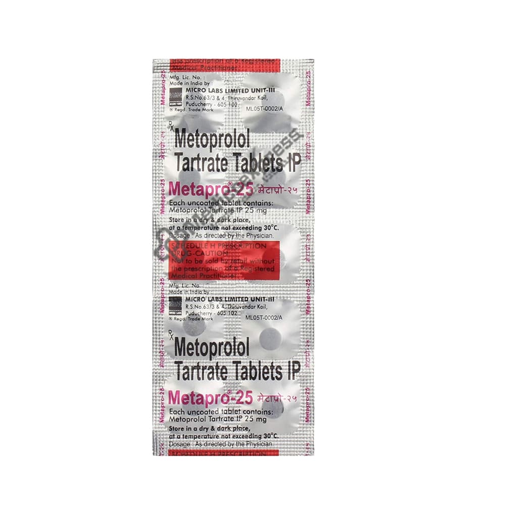 Metapro XL 25mg Tablet 15'S belongs to a class of drugs known as beta-blockers. It is used to treat high blood pressure (hypertension), angina (chest pain caused by a heart condition), and irregular heart rhythms (arrhythmia). It also aids in the prevention of future heart attacks and strokes, as well as migraines.Disclaimer:For More Information Contact Your Physician