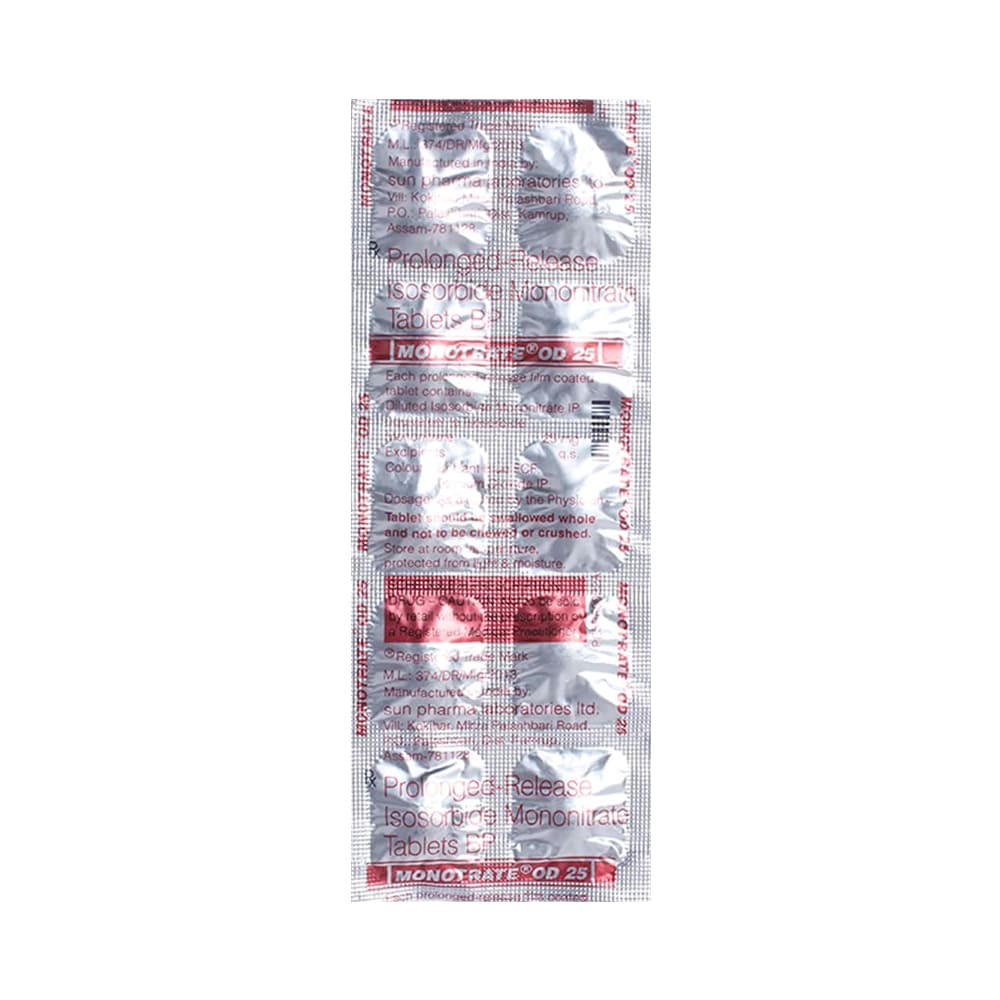 MONOTRATE OD 25MG TABLET is an organic nitrate with blood vessel dilation activity. It is used to treat angina pectoris, a heart condition in which blood vessels in the heart narrow unexpectedly and suddenly, resulting in decreased blood flow to the heart muscles, causing suffocation and a tight pain in the chest, neck, or arm area.Disclaimer:For More Information Contact Your Physician