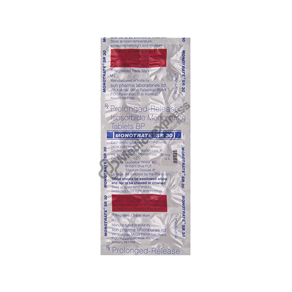 Monotrate SR 30 Tablet 10's is an organic nitrate with blood vessel dilation activity. It is used to treat angina pectoris, a heart condition in which blood vessels in the heart narrow unexpectedly and suddenly, resulting in decreased blood flow to the heart muscles, causing suffocation and a tight pain in the chest, neck, or arm area.Disclaimer:For More Information Contact Your Physician