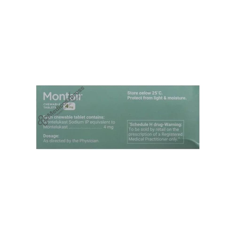 Montair 4mg Tablet 15 contains the leukotriene antagonist Montelukast. It reduces inflammation and swelling of airways in the lungs by blocking a chemical messenger (leukotriene). This makes breathing easier and helps to prevent asthma attacks.Disclaimer:For More Information Contact Your Physician