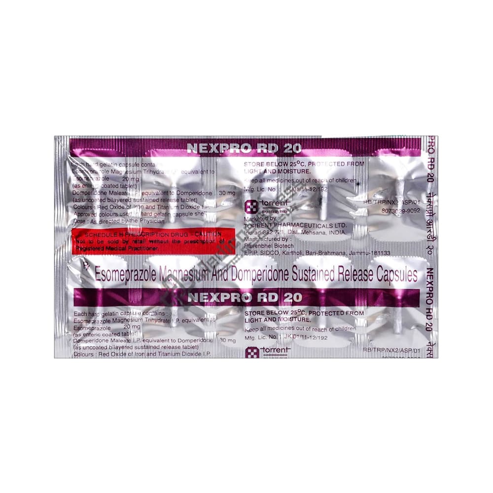 Nexpro Rd 20 Capsule 10's a Gastrointestinal Agent That Is Used To Treat Acid Reflux, Heartburn, Gastroesophageal Reflux Disease (Gerd), Zollinger-Ellison Syndrome, Nausea, Vomiting, Dyspepsia (Indigestion), Epigastric Pain, Peptic Ulcers, And Helicobacter Pylori Infection.Disclaimer:For More Information Contact Your Physician
