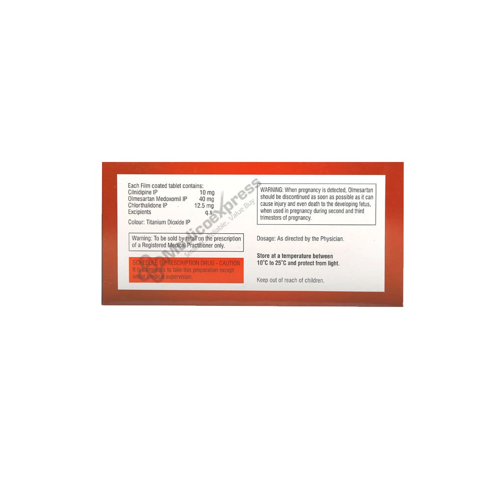 Olkem Trio 40 mg Tablet 10's are a member of the hypertensives drug class, which is primarily used to treat high blood pressure (high blood pressure). A persistent illness known as hypertension or high blood pressure causes a strong force of blood against the arterial wall. It therefore causes heart conditions, irregular heartbeats, and other issues. Three medications—Olmesartan medoxomil, Cilnidipine, and Chlorthalidone—are combined to create the Olkem Trio 40 mg Tablet 10's, which effectively lowers high blood pressure. By inhibiting the hormone angiotensin, olmesartan medoxomil relaxes blood arteries. This makes the heart's pumping action more effective and the blood flow more smoothly. The calcium channels found in the blood arteries of the heart are inhibited by cilnidipine. Disclaimer:For more information contact your physician.