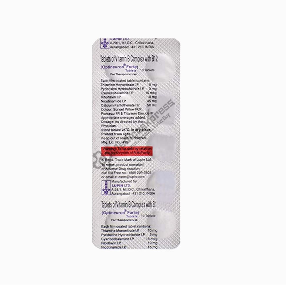 Optineuron Forte Tablet 10s includes products that are primarily used to correct nutritional deficiencies. When the body cannot absorb enough nutrients from meals or does not acquire enough of them, nutritional deficiency results. Defective bone growth, skin conditions, digestive problems, and dementia are just a few of the health issues it may cause (memory loss). B-complex supplement Optineuron Forte Tablet 10s contains calcium pantothenate, cyanocobalamin, nicotinamide, pyridoxine, riboflavin, and thiamine. The utilisation of fats, proteins, and carbs by the organism is aided by calcium pantothenate (vitamin B5). A type of vitamin B12 called cyanocobalamin aids in the development of red blood cells as well as the healthy operation of the nervous system and the brain. Different types of vitamin B include riboflavin (vitamin B2), thiamine (vitamin B1), nicotinamide (niacinamide/vitamin B3), pyridoxine (vitamin B6), and riboflavin.Disclaimer:For more information contact your physician.