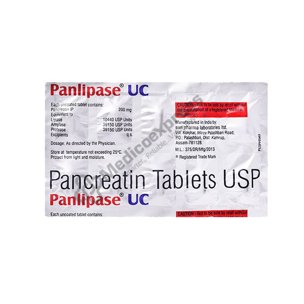 Panlipase UC Tablet is used to treat a lack of pancreatic enzymes. It is a digestive enzyme supplement that contains pancreatic enzymes. This medication also helps to reduce bowel frequency and stomach discomfort.Disclaimer:For More Information Contact Your Physician