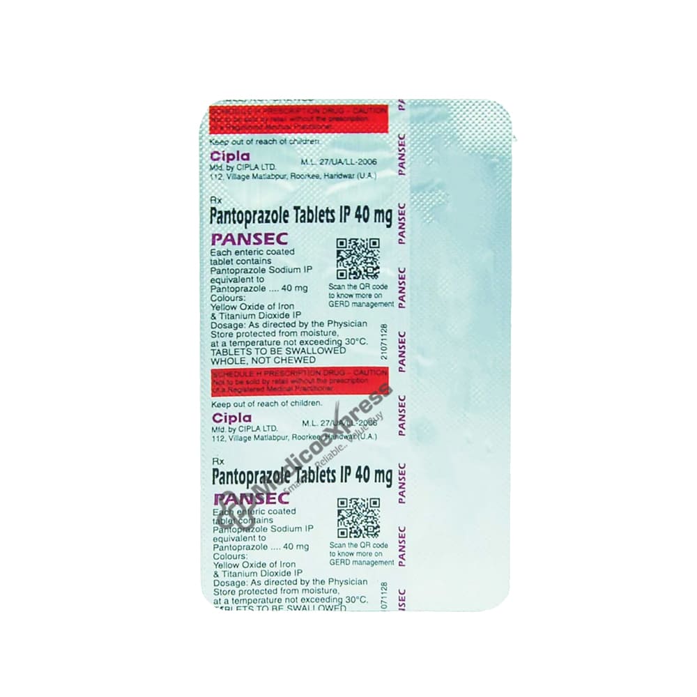 Pantoprazole, found in PANSEC 40MG TABLET, belongs to a class of drugs known as proton pump inhibitors. It is used to treat peptic ulcers, gastroesophageal reflux disease (GERD), and reflux esophagitis, as well as the symptoms associated with these conditions, including acidity, heartburn, acid reflux, and swallowing pain.Disclaimer:For More Information Contact Your Physician
