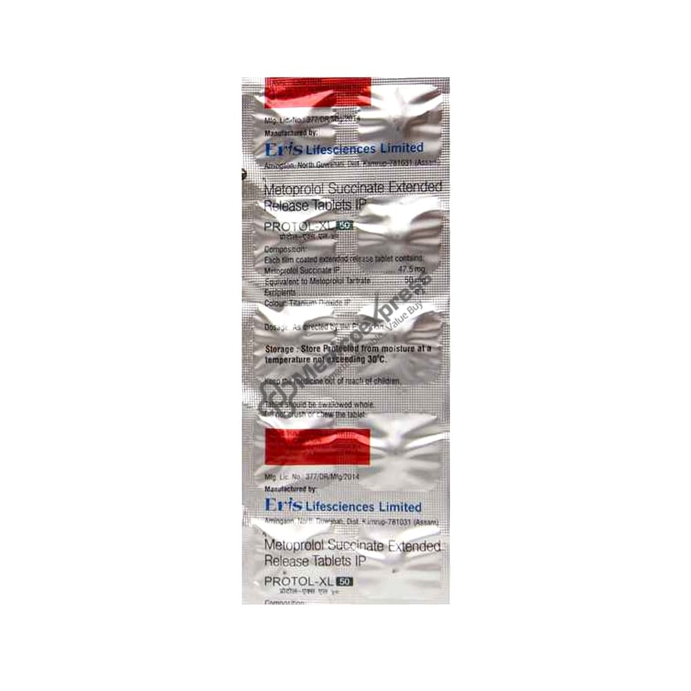 Protol XL 50 Tablet 10's belongs to a group of medicines called beta-blockers used to treat high blood pressure (hypertension), heart-related chest pain (angina), irregular heart rhythm (arrhythmia), and to protect the heart after a heart attack (myocardial infarction). Disclaimer:For More Information Contact Your Physician