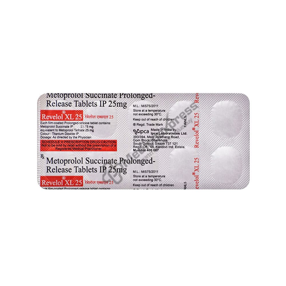 Revelol XL 25 Tablet 15's belongs to a class of drugs known as beta-blockers. It is used to treat high blood pressure (hypertension), angina (chest pain caused by a heart condition), and irregular heart rhythms (arrhythmia). It also aids in the prevention of future heart attacks and strokes, as well as migraines.Disclaimer:For More Information Contact Your Physician