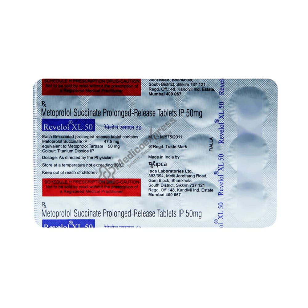 Revelol XL 50 Tablet 15's belongs to a class of drugs known as beta-blockers. It is used to treat high blood pressure (hypertension), angina (chest pain caused by a heart condition), and irregular heart rhythms (arrhythmia). It also aids in the prevention of future heart attacks and strokes, as well as migraines.Disclaimer:For More Information Contact Your Physician