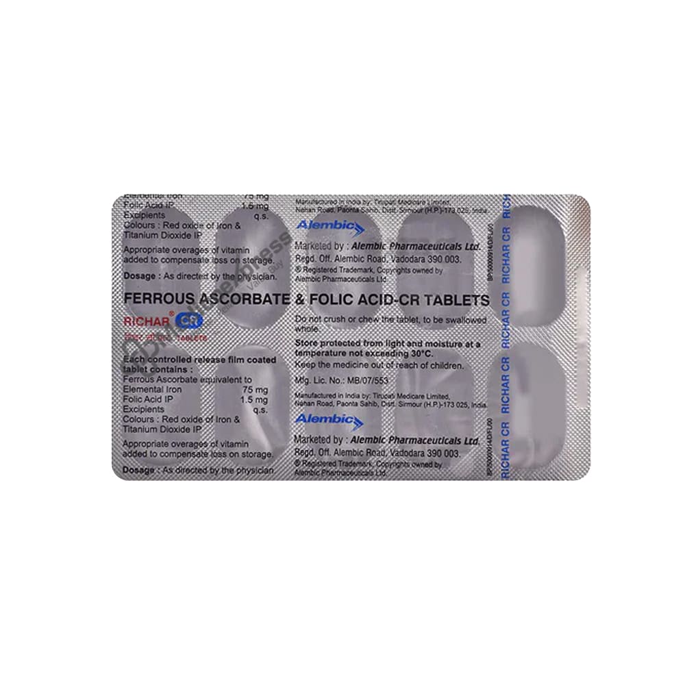 Richar CR Tablet is a nutritional supplement containing ferrous ascorbate and folic acid that promotes a healthy, functional body. It aids the body in the production of red blood cells and nerve cells. The body's need for iron and folic acid increases during pregnancy. Iron is essential for the mother's and developing baby's health. Anaemia can occur in either the mother or the baby if there is insufficient iron. As a result, it is critical that the body receives adequate iron for both the mother and the developing baby.Disclaimer:For More Information Contact Your Physician