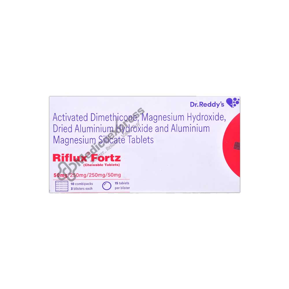 Riflux Fortz Tablet 15'S requires a prescription. Heartburn, acid reflux, and stomach ulcers can all be treated with it. It eases symptoms including stomach ache or irritability. Additionally, it aids in balancing and letting go of stomach gas that has built up. Three medications are included in each Riflux Fortz Chewable Tablet. Follow your doctor's advice regarding the dosage and duration of this medication. It should be consumed orally before meals, ideally before bed. Take this medication as soon as you remember if you happen to miss a dose. Always finish the recommended course of treatment. A higher dose of this medication should not be taken since it may have negative effects on the body. The majority of people tolerate this medication well.Disclaimer:For more information contact your physician.