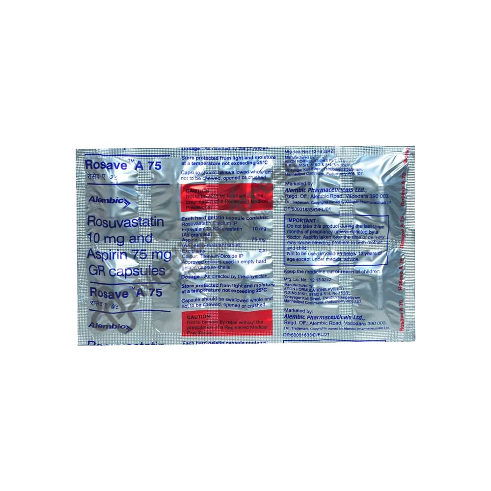 Rosave A 75 Capsule 10 is a blood-thinning and cholesterol-lowering agent that is primarily used to prevent myocardial infarction (heart attack), stroke, or peripheral vascular disease. It is also used to treat the body's abnormally high cholesterol or fat levels (hyperlipidaemia or dyslipidaemia). A heart attack occurs when a blood clot prevents blood from flowing to the heart. This artery blockage is frequently caused by an accumulation of fat, cholesterol, and other substances, which form a plaque in the arteries that supply the heart (coronary arteries).Disclaimer:For More Information Contact Your Physician