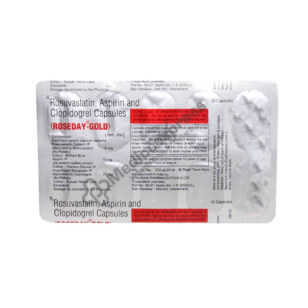 Roseday-Gold Capsule 10's Belongs To a Group Of Antihyperlipidemic And Antiplatelets Used To Treat Heart Attack, Myocardial Infarction (Blockage Of The Blood To Muscles Of The Heart), Angina (Chest Pain), And Stroke. Disclaimer:For More Information Contact Your Physician