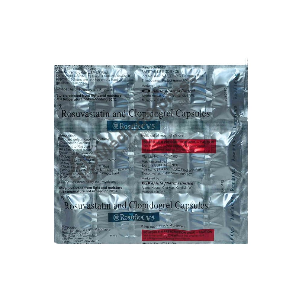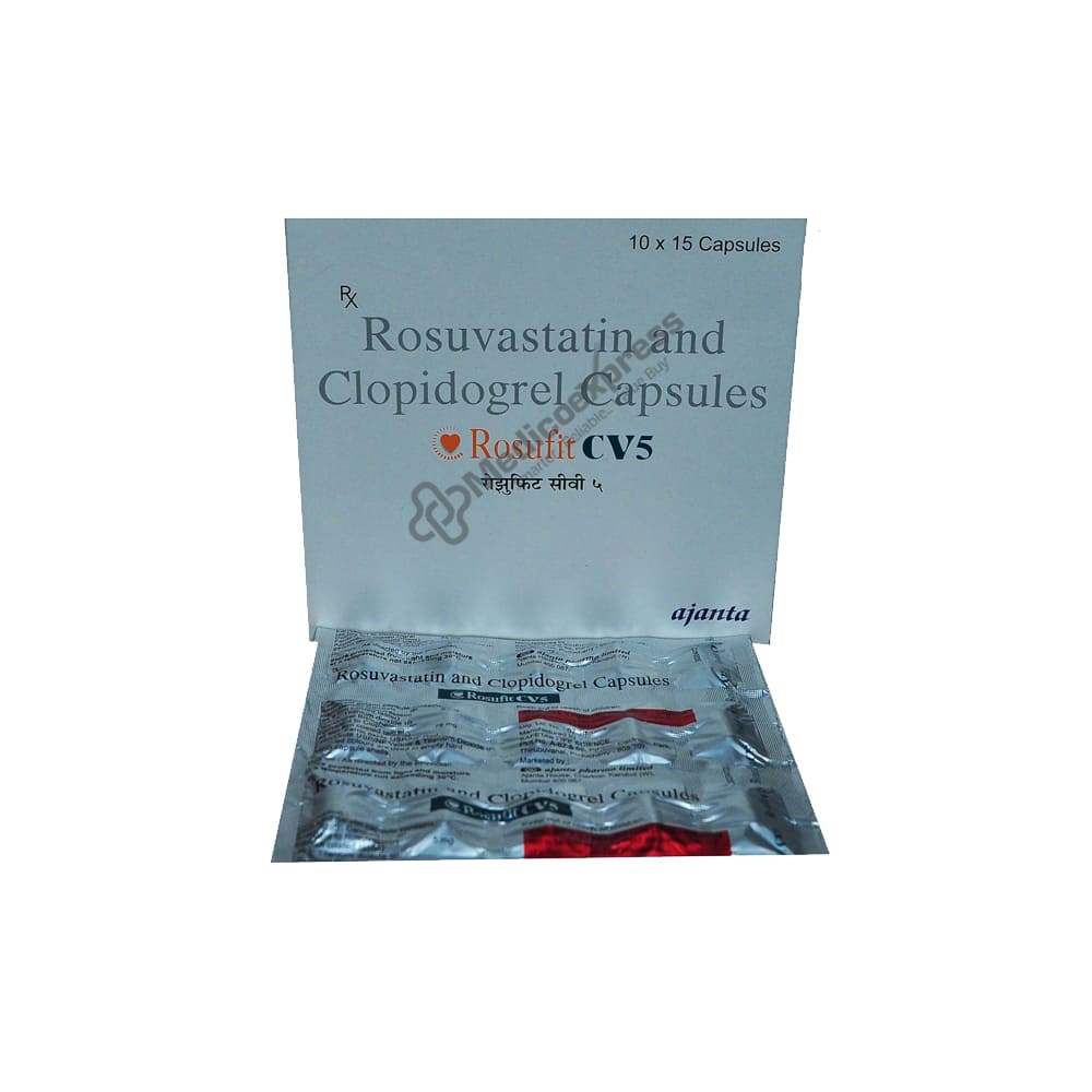 Rosufit CV 5 Capsule 15's a combination drug made up of a blood thinner and a cholesterol-lowering agent that is primarily used to prevent future heart attacks and strokes. It reduces the elevated levels of cholesterol and fats (triglycerides) in our bodies.Disclaimer:For More Information Contact Your Physician