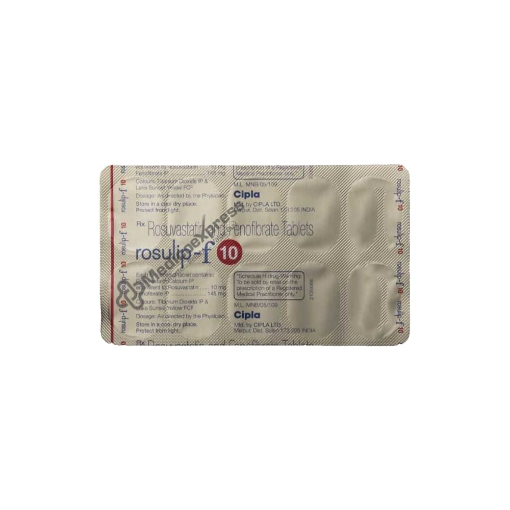 Rosulip-F 10 Tablet 10 is a lipid-lowering agent that is used to lower high levels of total cholesterol (TC) and triglyceride (TG). This reduces the risk of future cardiovascular events such as heart attack, stroke, and heart-related chest pain (angina).Disclaimer:For More Information Contact Your Physician