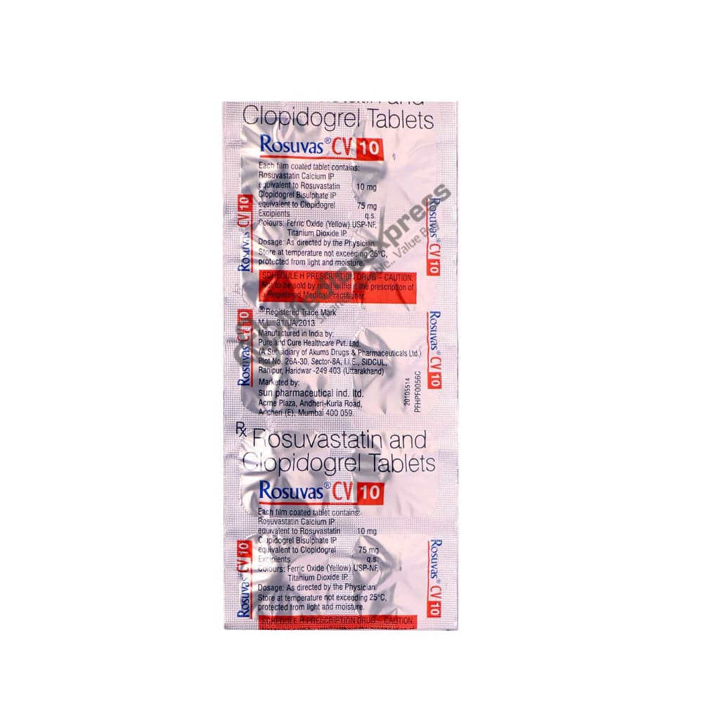 Rosuvas Cv 10’s Tablet 10's Is a Combination Medicine Made Up Of a Blood Thinner And a Cholesterol-Lowering Agent That Is Primarily Used To Prevent Future Heart Attacks And Strokes.Disclaimer:For More Information Contact Your Physician