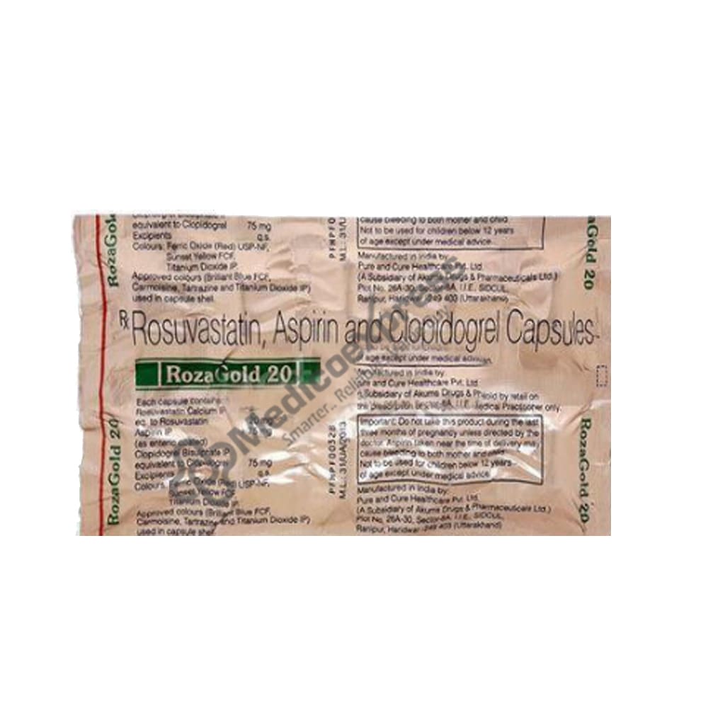 ROZAGOLD 20MG is a combination of aspirin, clopidogrel, and rosuvastatin, all of which are nonsteroidal anti-inflammatory drugs, antiplatelets, and HMG-CoA reductase inhibitors.Disclaimer:For More Information Contact Your Physician