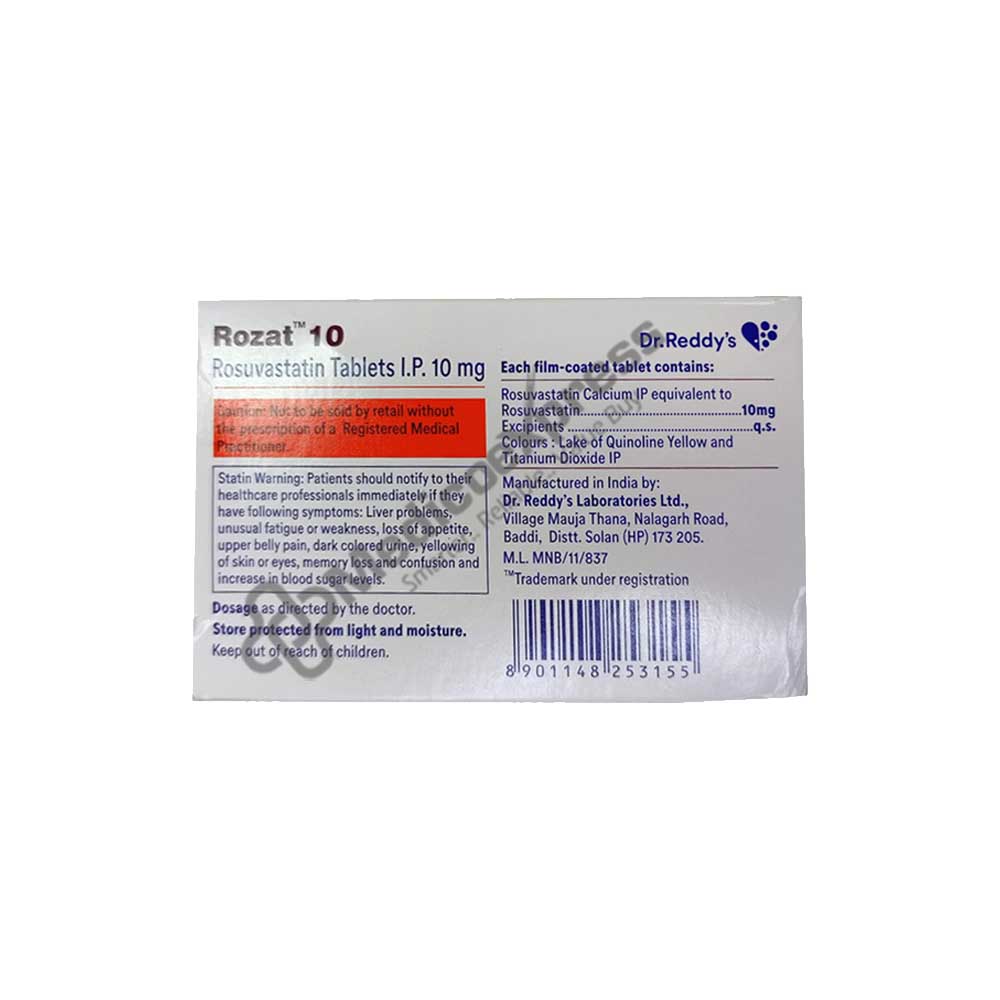 Rozat 10 mg Tablet 15s is a member of the statin drug class, which lowers levels of glycerides and bad cholesterol (low-density lipoprotein, or LDL), lowering the risk of heart attack and stroke in the future. When there is an excess of the wrong kind of cholesterol balance in the blood, it is called hyperlipidemia or dyslipidemia, and it raises the blood cholesterol level. Your arteries become restricted and clogged when your blood cholesterol level is high, which eventually leads to heart disorders like stroke and heart attack. Rozat 10 Tablet 15s function by preventing the liver from producing as much cholesterol by blocking liver enzymes. The liver's ability to absorb and break down circulating cholesterol is improved with Rozat 10 Tablet 15. Rozat 10 Tablet 15's reduces lipid levels as a result. Disclaimer:For more information contact your physician.
