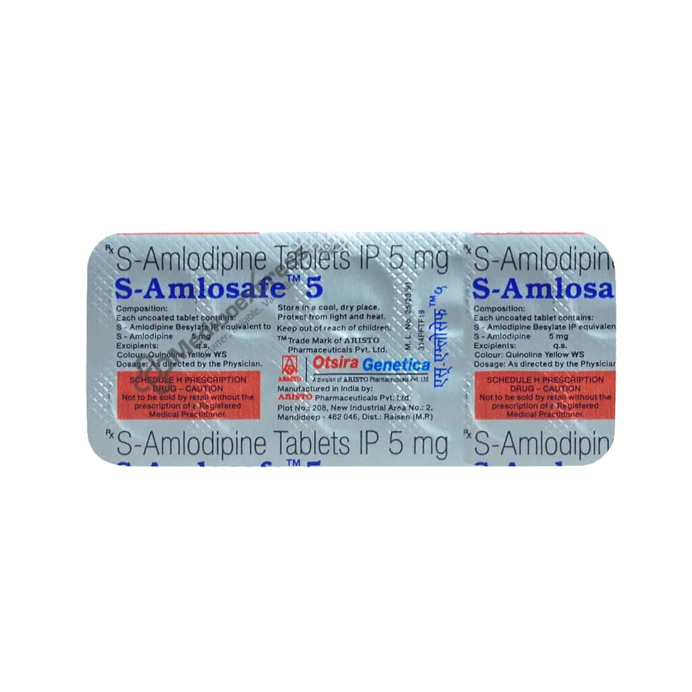S Amlosafe 5mg Tablet 10'S is used to treat essential hypertension (abnormally high blood pressure caused primarily by obesity, family history, or a poor diet), angina pectoris, and other conditions (type of chest pain due to reduced blood flow to the heart). Patients with specific heart conditions should not use S Amlosafe 5mg Tablet 10'S. In patients with liver and kidney disease, S Amlosafe 5mg Tablet 10'S should be used with caution. Only if specifically recommended by a doctor may pregnant or nursing women use S AMLOSAFE. Consult your doctor before taking S AMLOSAFE as it should be taken with caution in older individuals. Headaches, nausea, and abdominal pain are the most frequent side effects of S Amlosafe 5mg Tablet 10'S. Disclaimer:For more information contact your physician.