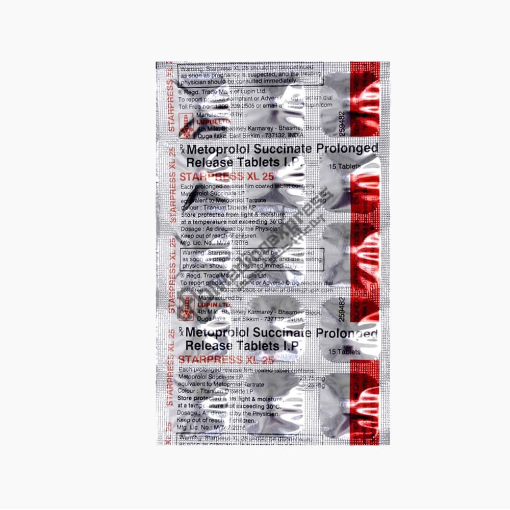 Starpress XL 25 Tablet belongs to a class of drugs known as beta blockers. It is used to treat high blood pressure (hypertension), angina (chest pain caused by a heart condition), and irregular heart rhythms (arrhythmia). It also aids in the prevention of future heart attacks and strokes, as well as migraines.Disclaimer:For More Information Contact Your Physician