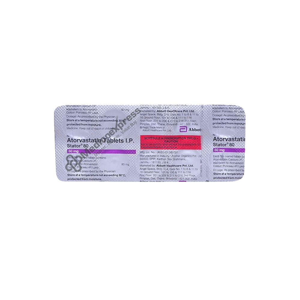 STATOR 80MG TABLET contains Atorvastatin, a medication in the Lipid-lowering drug class. When diet and lifestyle changes do not produce an adequate response, it is used to reduce elevated high blood cholesterol levels (hyperlipidaemia) in patients.Disclaimer:For More Information Contact Your Physician