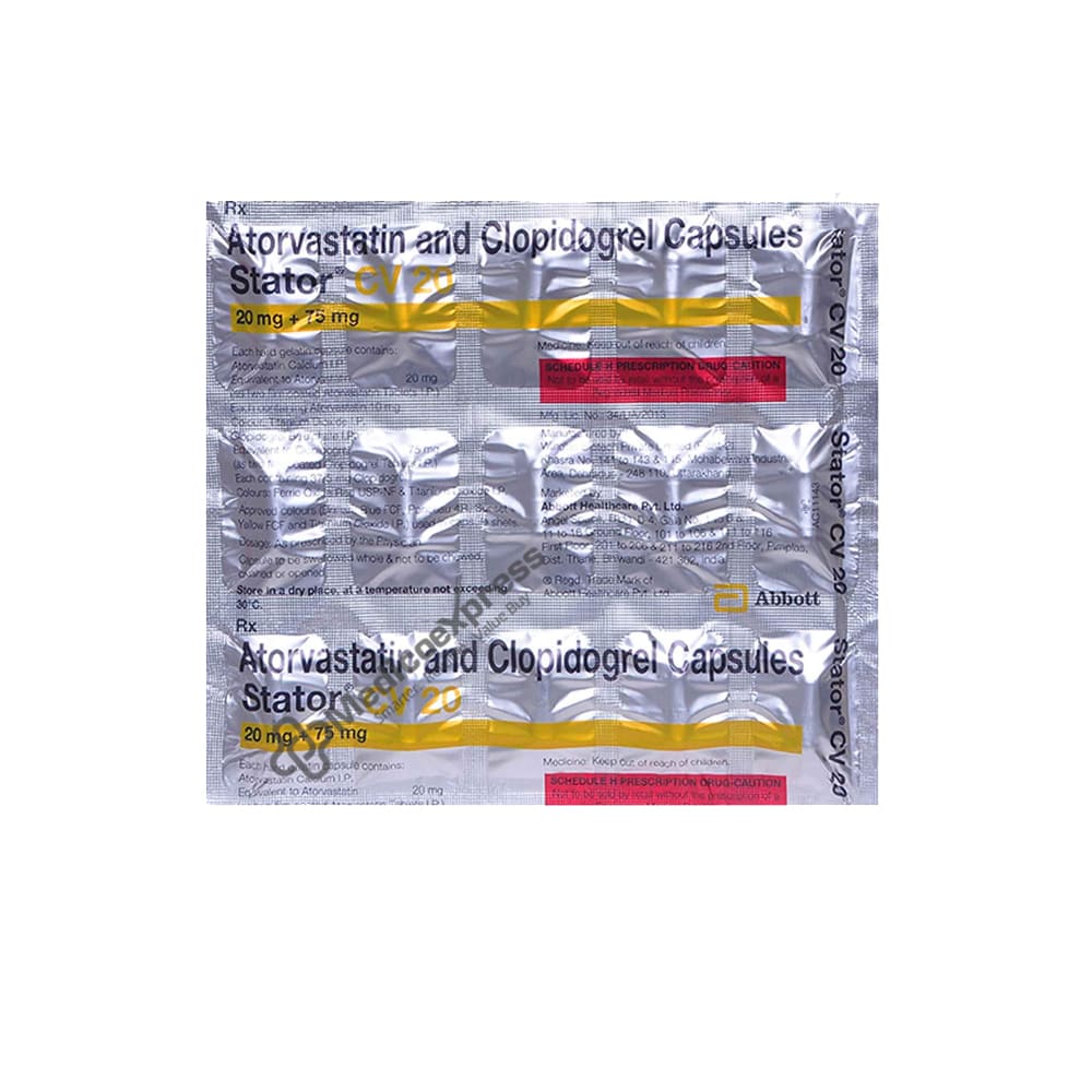Stator CV 20 Capsule 15's is a combination drug made up of a blood-thinning agent and a cholesterol-lowering agent that is primarily used to prevent future heart attacks and strokes. It lowers our bodies' elevated levels of cholesterol and fats (triglycerides).Disclaimer:For More Information Contact Your Physician