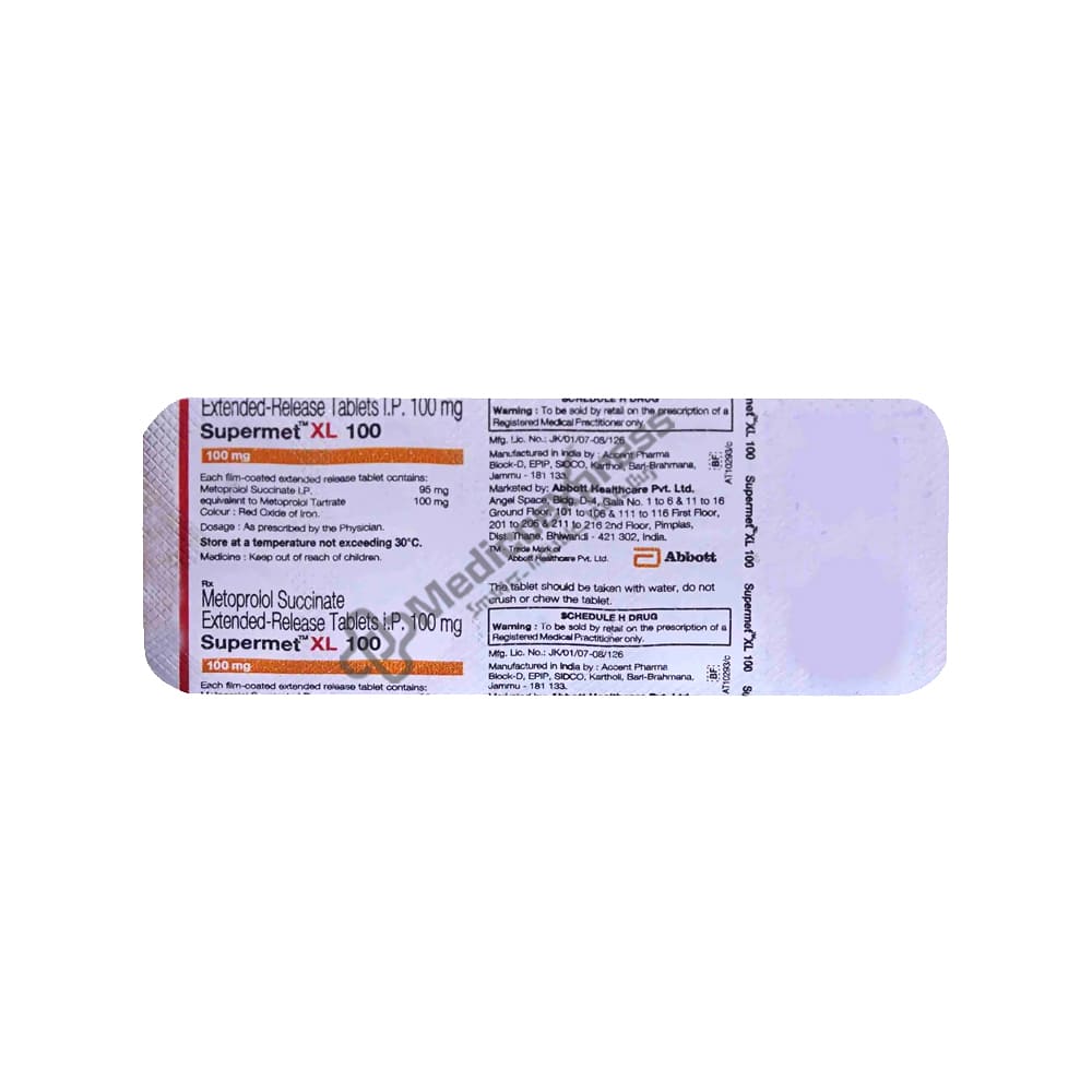 Supermet XL 100 mg Tablet 10's is a member of the beta-blocker class of medications. It is used to treat angina (chest pain associated with the heart), high blood pressure (hypertension), and abnormal heart rhythms (arrhythmia). Furthermore, it aids in the prevention of stroke, future heart attacks, and migraines. Supermet XL 100 Tablet may be prescribed either by itself or in combination with other drugs. The purpose for which you are taking medication and the seriousness of your ailment will determine the dosage and frequency. You can take it on an empty stomach or with food, but for the best results, take it consistently at the same time every day. Before you experience the full benefits of this medication, it could take a few weeks, and you might need to take it for the rest of your life. Disclaimer : For More Details, Contact Your Physician