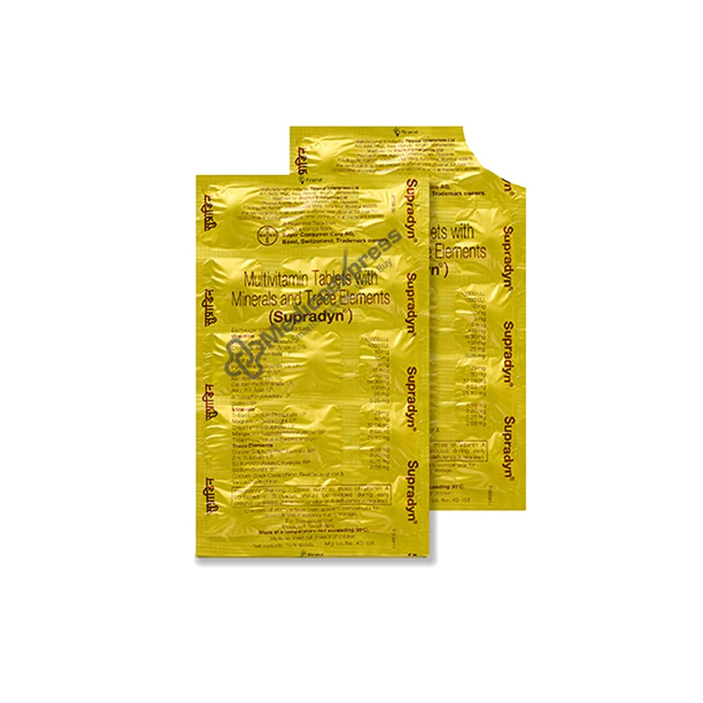 Supradyn tablet is a multivitamin, mineral, and trace element supplement that promotes overall health and wellness. It aids in the fight against infections by increasing immunity. It is also used to treat stomach problems, anaemia, and grey hair.Disclaimer:For More Information Contact Your Physician
