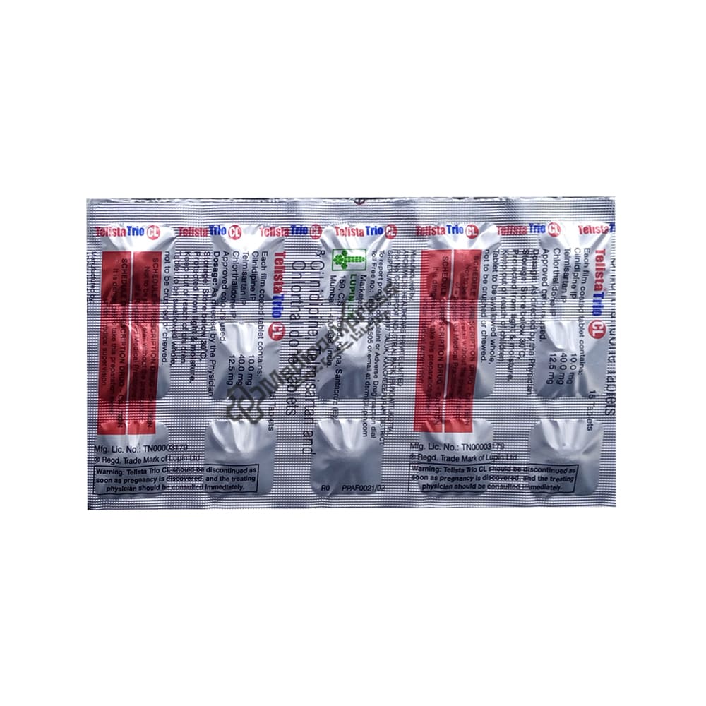 Telista Trio Cl 10/40/12.5Mg Tablet 15's is a diuretic (water tablet that increases urine production) that is primarily used to treat excessive blood pressure, heart failure, and oedema (a build up of fluid in the body).Disclaimer:For More Information Contact Your Physician