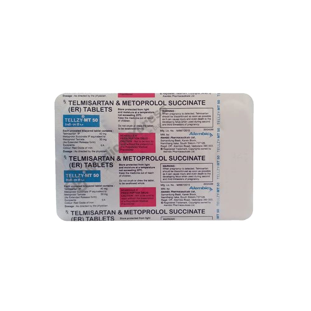 TELLZY MT 50MG TABLET is a combination of Metoprolol and Telmisartan, both of which are anti-hypertensive medications. It is used to treat high blood pressure.Disclaimer:For More Information Contact Your Physician
