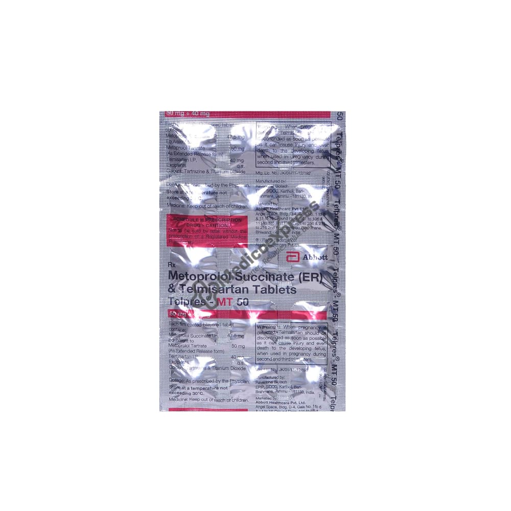 Telpres-MT 50 gm Tablet 15's are used to treat hypertension (high blood pressure). Future heart attacks and strokes may be prevented with its help. When the blood's push on the artery walls is too great, high blood pressure results, which causes hypertension. High blood pressure can cause headaches, dizziness, nosebleeds, visual problems, chest pain, weakness, and dyspnea (shortness of breath). Combining Telmisartan and Metoprolol, Telpres-MT 50 gm Tablet 15's are a two-drug treatment for high blood pressure. Angiotensin II receptor antagonists, of which telmisartan is a member, are a class of medications that reduce blood pressure by relaxing blood vessels and inhibiting the angiotensin II receptor.Disclaimer : For More Details, Contact Your Physician