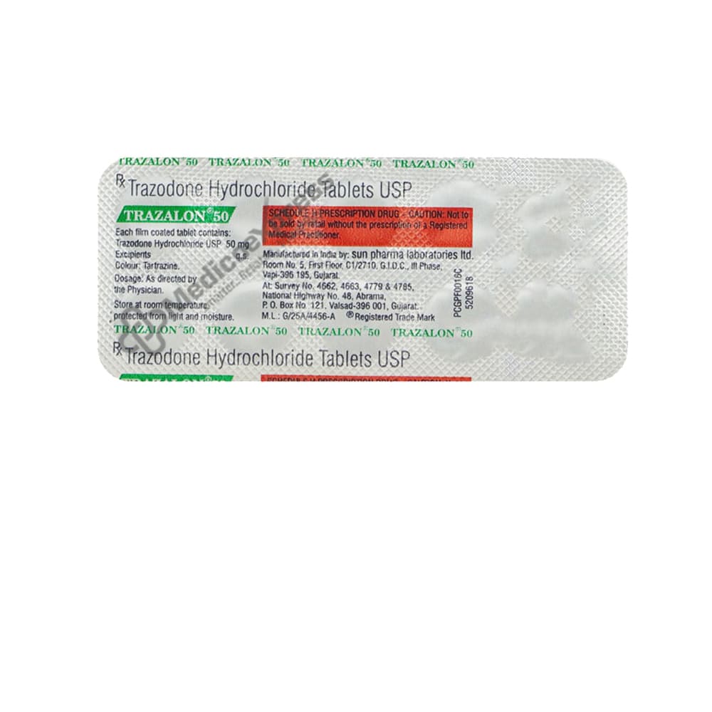 Trazalon 50 Mg Tablet Is Used To Treat Depression.This Medication Works By Increasing The Amount Of Chemical Messengers In The Brain That Relax The Nerves And Have a Calming Effect On The Brain.Disclaimer:For More Information Contact Your Physician