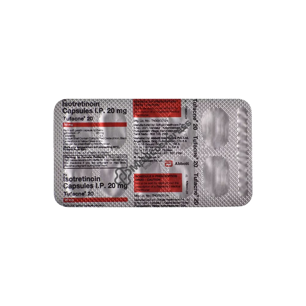 TUFACNE 20MG CAPSULE contains Isotretinoin, which belongs to the Retinoids class of medications. It is used to treat severe acne in adults and children over the age of 12 (such as nodular acne, conglobate acne, and acne at risk of permanent scarring) that has not improved after other anti-acne treatments. Acne is an inflammatory skin condition characterised by spots, oily skin, nodular lesions, and other painful symptoms on the face, back, and chest.Disclaimer:For More Information Contact Your Physician