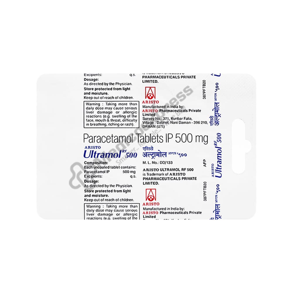 ULTRAMOL RF 500 TABLET contains Paracetamol, a medication in the Analgesics and Antipyretics class. It's used to treat mild to moderate pain (including headaches, backache, toothache, severe nerve pain, sore throat, period pain, low back and leg pain, muscle, connective tissue and joint pain, symptomatic relief of sprains, strain, joint swelling and stiffness). It is also used to treat cold or flu symptoms and lower fever (high body temperature).Disclaimer : For More Details, Contact Your Physician