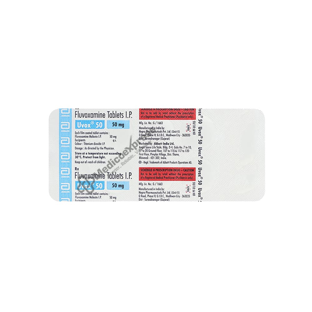 UVOX 50MG TABLET contains Fluvoxamine, which belongs to a class of drugs known as Selective serotonin reuptake inhibitors (SSRIs). It is used to treat depression (a mood disorder characterised by persistent sadness and loss of interest) and obsessive-compulsive disorder (OCD).Disclaimer:For More Information Contact Your Physician