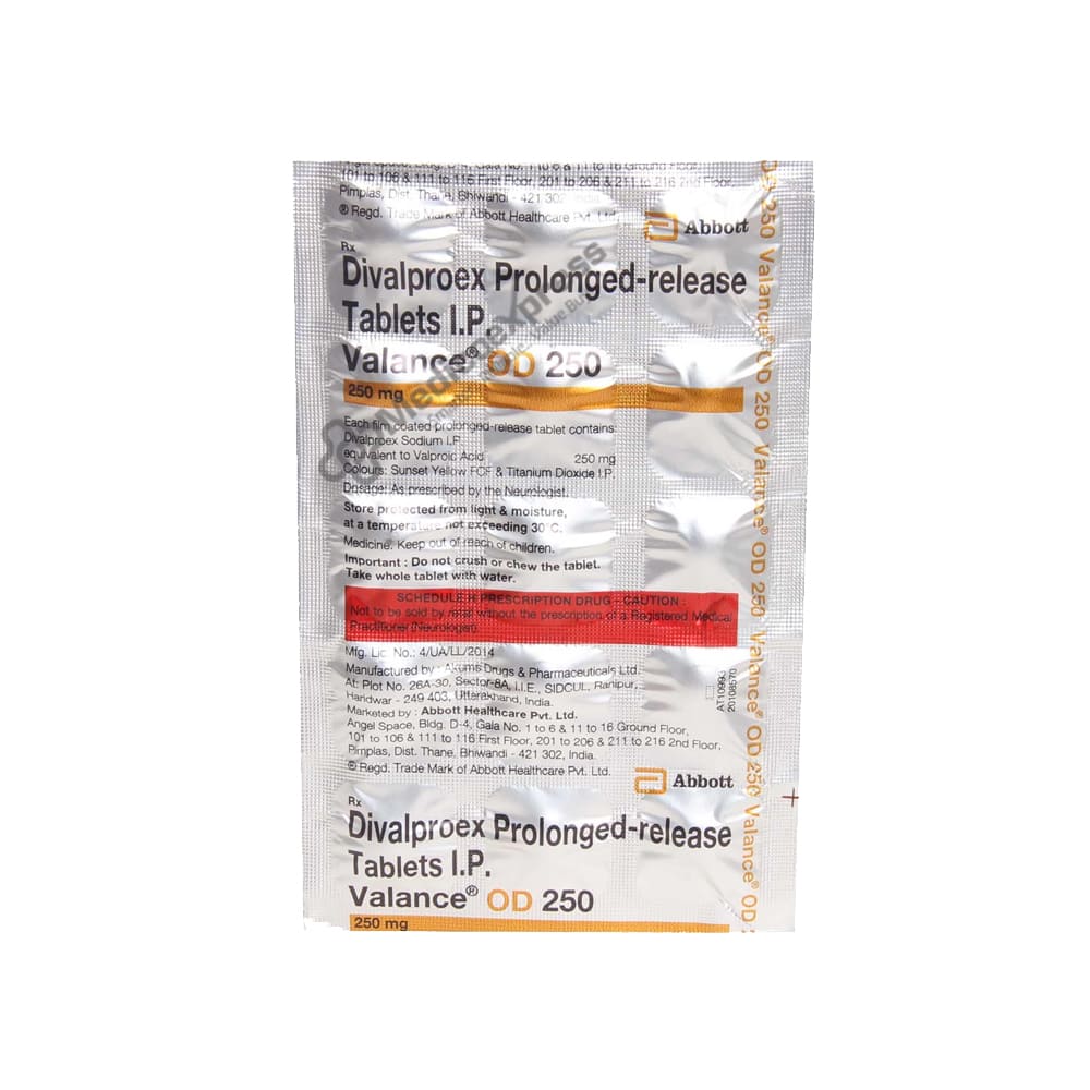 Valance OD 250 Tablet 15's is an anticonvulsant or anti-epileptic medication used to treat epilepsy/seizures/fits. Valance OD 250 Tablet 15's is also used to treat manic episodes caused by bipolar disorder and to prevent migraines.Disclaimer:For More Information Contact Your Physician