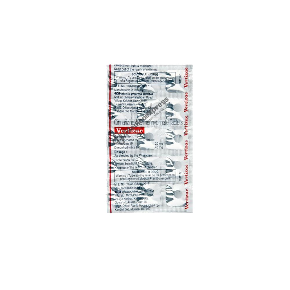 Vertizac Tablet 20/40 mg 15'S is a combination drug that works by calming the smooth muscles in the blood vessels in the ear and increases blood flow. Additionally, it inhibits the activity of a chemical messenger that causes dizziness and vertigo. To prevent stomach upset, use Vertizac Tablet with food. It is best to take this medication at a certain time each day, as recommended by your doctor. You should not miss any doses, but if you do, take the missed dose of this medication as soon as you recall. Never stop taking this medication suddenly without first consulting your doctor, and complete the entire course of treatment. Dry mouth and stomach ache are a couple of the more frequent adverse effects of this medicine.Disclaimer:For more information contact your physician.
