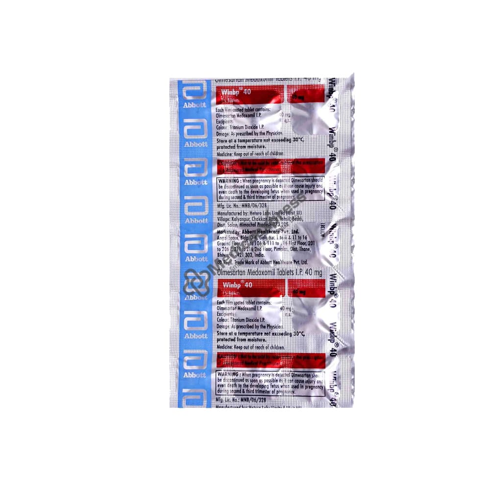 Winbp 40 mg Tablet 15's is used to treat heart failure and high blood pressure. Blood pressure reduction aids in reducing the risk of future heart attacks and strokes. Using this medication can help diabetic patients maintain kidney function. One may be prescribed Winbp 40 Tablet alone or in conjunction with other drugs. It can be taken during the day or at night, with or without food. To obtain the most effect, aim to take it at roughly the same time each day. Even if you feel OK or if your blood pressure is under control, it's crucial to keep measuring it periodically. The majority of people who have high blood pressure do not experience any symptoms, but if you stop taking this medication, your condition could worsen.Disclaimer : For More Details, Contact Your Physician