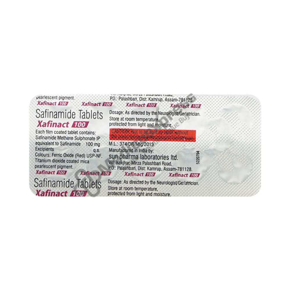 Xafinact 100 Tablet is a Parkinson's disease medication. It aids in the control of body movements and the prevention of excessive shaking and stiffness. It raises the concentration of dopamine, a chemical in the brain that is important for movement control.Disclaimer:For More Information Contact Your Physician