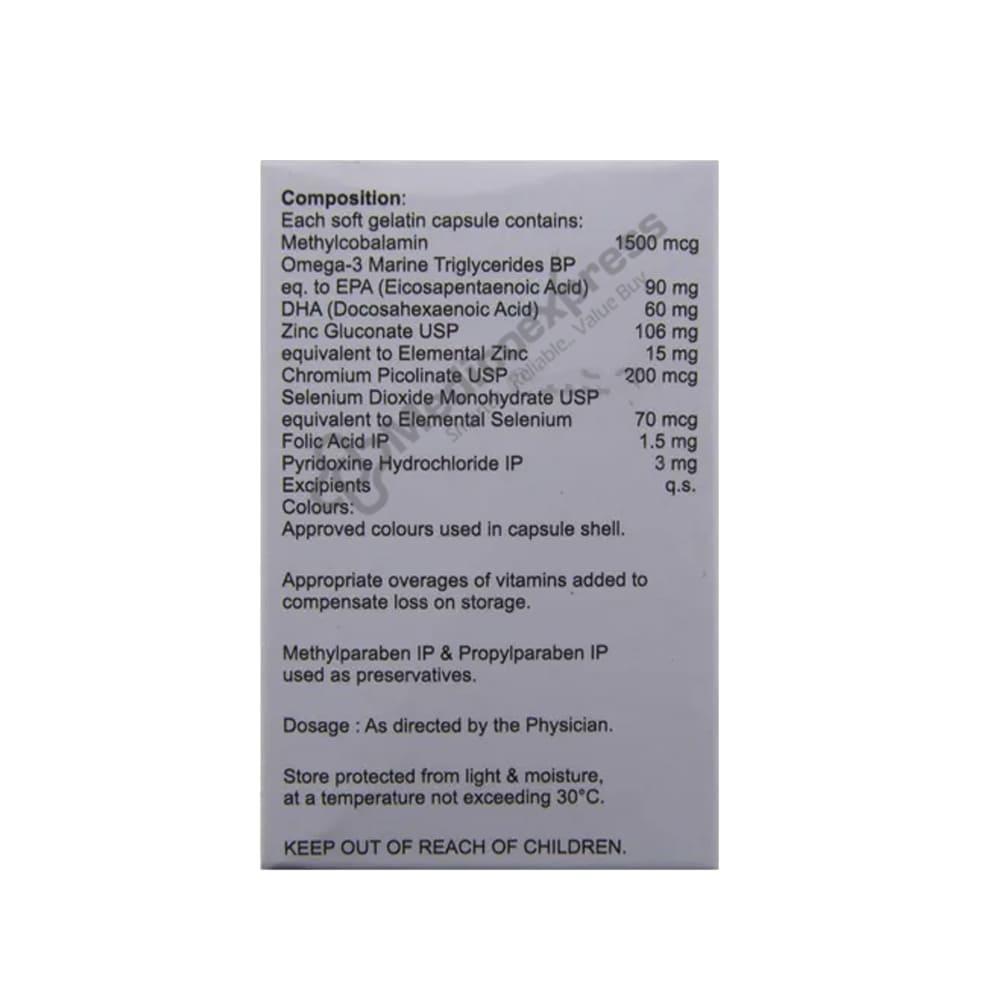 Zelita 7 Soft Gelatin Capsule 10's includes methylcobalamin, folic acid, pyridoxine, omega-3 fatty acids including docosahexaenoic acid and eicosapentaenoic acid, as well as minerals like zinc and selenium.The production of healthy blood cells is enhanced by methylcobalamin (Vitamin B12). For the purpose of producing energy, folic acid increases the metabolism of lipids and carbohydrates. The body needs enough pyridoxine to increase protein and fat metabolism, maintain the health of the nerves, and produce healthy red blood cells.Disclaimer:For more information contact your physician.